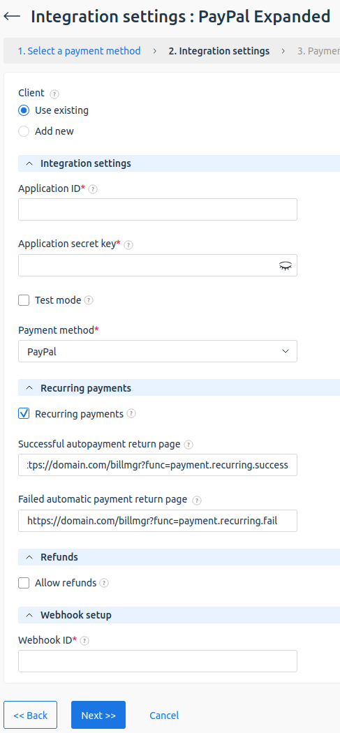 Fill in the form using existing customer data from the payment system:- Application ID — unique application identifier. To find it, log in to your PayPal Developer account, go to Dashboard → REST API apps → application parameter Client ID.