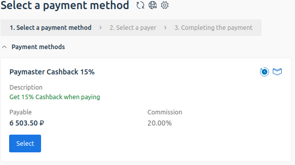 When creating a payment, BILLmanager checks if there are any payment methods that can be used to accrue a cashback. The payment effected by this method of payment is registered to participate in the promotion.