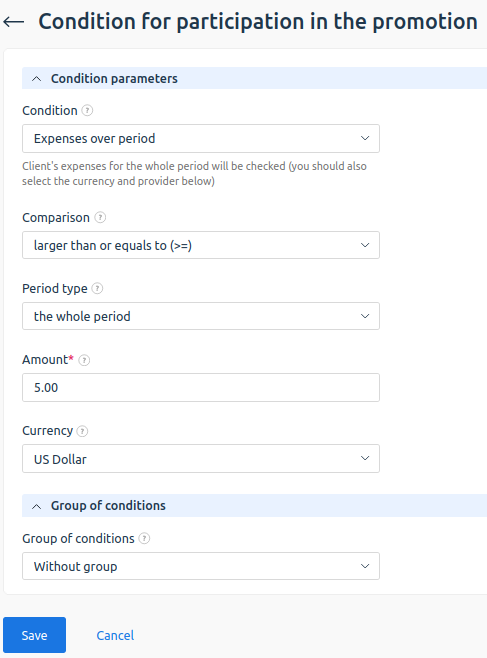 - Specify the Condition group. If the provider uses a group of conditions in the promotion, the client only needs to fulfill any condition from this group. If two groups of conditions or more are used, the client needs to fulfill at least one condition from each group.
