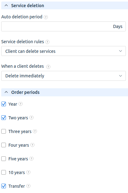 - When a client deletes — order periods available in tariff plan settings. If you plan to offer domain name transfer to your clients, you shall enable Transfer period here.