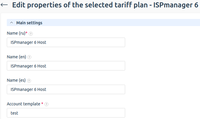 Account template — name of the template used to create the client account in ispmanager. The template determines which resources the client can use and in what quantity. Creation and configuration are performed on the ispmanager side: go to ispmanager → Cluster Settings → Templates.