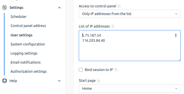 - In the Access Settings section, in the Access to control panel field, select the value "Only from IPs in the list".