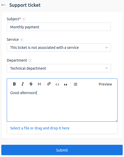 - Choose the Department you want to send the ticket to. Providers might charge for support in some cases. In these cases, the ticket creation form will show the number of tickets available and warn you additionally if the ticket will have to be paid.