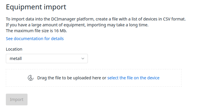 Go to Settings → Equipment import . Specify the Location to which the equipment will be added. Select the file to upload. Click Import . Interface of the Equipment import window Upon completion of the operation, you will receive a notification in the platform interface.