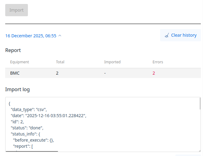 Diagnostics After performing at least one operation, you can view its execution logs in the Equipment import window.