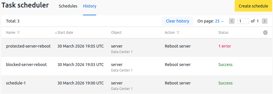 To view the history of executed tasks, click History in the Task Scheduler window. A tab will open displaying completed tasks. For each task, the following may be displayed:
