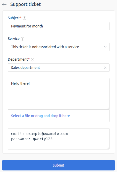 Do not pass the password directly in open form in the request text. Use Login details field, this is safer. - Press Submit to send the ticket to the support center.