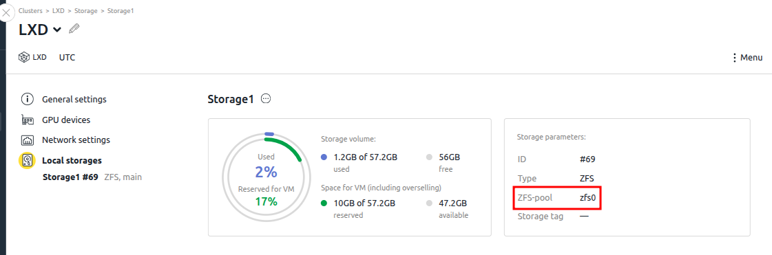 lsblkIn the example, the name of the second disk is vdb, so the name of the block device is /dev/vdb.Example outputNAME MAJ:MIN RM SIZE RO TYPE MOUNTPOINT loop0 7:0 0 91.9M 1 loop /snap/lxd/32662 loop1 7:1 0 40.9M 1 loop /snap/snapd/20290 loop2 7:2 0 49.3M 1 loop /snap/snapd/24792 loop3 7:3 0 63.3M 1 loop /snap/core20/1828 loop5 7:5 0 73.9M 1 loop /snap/core22/2045 loop6 7:6 0 114.4M 1 loop /snap/lxd/33110 sr0 11:0 1 1024M 0 rom vda 252:0 0 50G 0 disk ├─vda1 252:1 0 1M 0 part └─vda2 252:2 0 50G 0 part / vdb 252:16 0 50G 0 disk - Define the pool name. To do this, in the platform interface, go to Clusters → select a cluster → Parameters button → Local storages section → ZFS-pool parameter.
