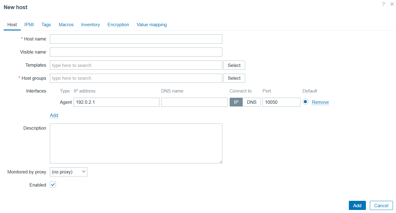 - Monitored by proxy — proxy used. Select the name of the proxy, if you are using one.