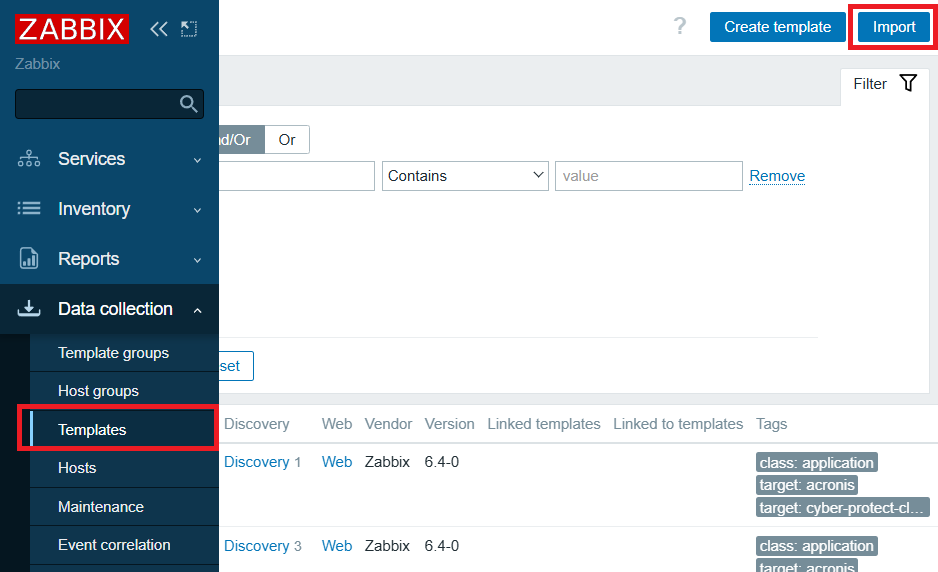 - Import the downloaded templates into Zabbix: Data collection → Templates → Import → select the template file → Import → Import.