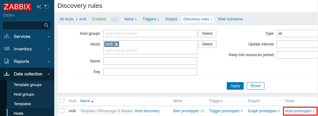 Under Discovery Rules in the Template VMmanager 6 Master: Host discovery line, click Host prototypes.