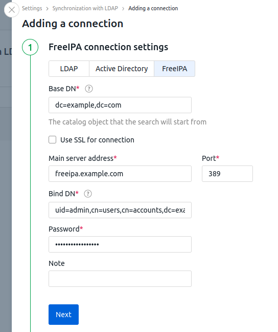 example.comdirectory, specify"dc=example,dc=com". - For SSL connection, enable the Use SSL to connect option.