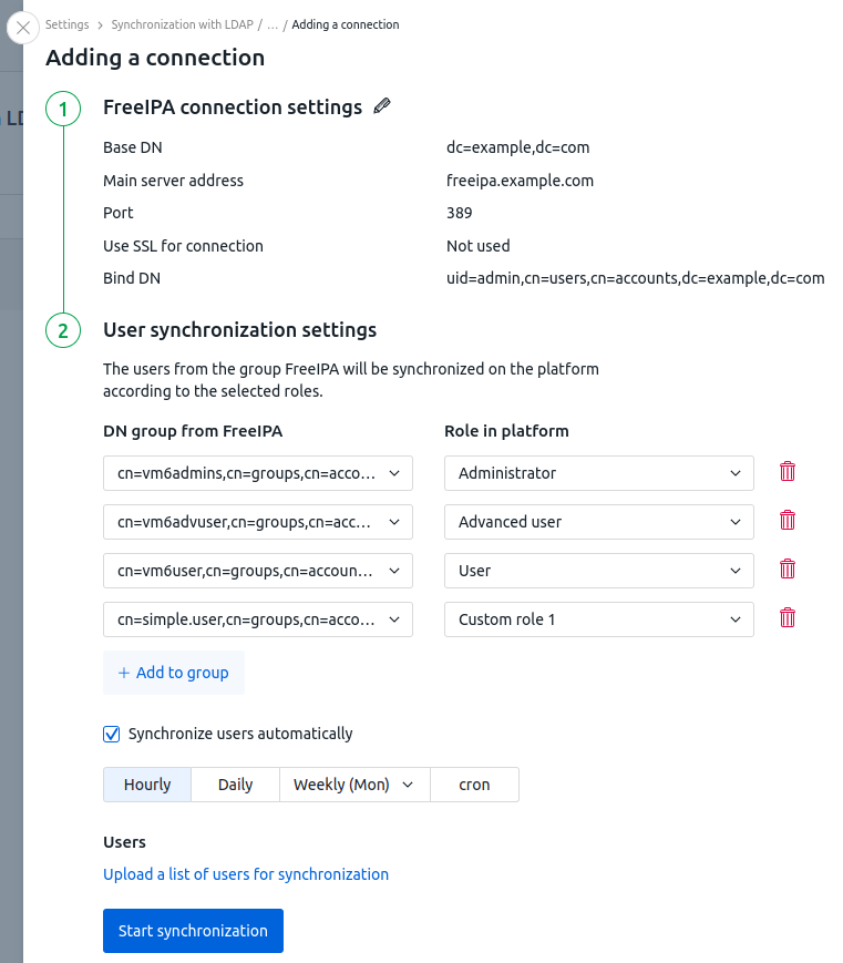 - Click Start synchronization button. The platform will start the synchronization process. The synchronization time depends on the number of users in LDAP and may take several minutes.