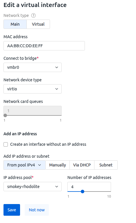 - If you need to set a specific MAC address for an interface, enter it. If the value is blank, the platform will generate the MAC address automatically.
