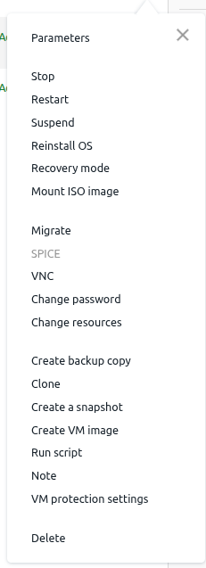 - Create VM image — create a user image based on the disk of the virtual machine. Read more in Creating a disk image;