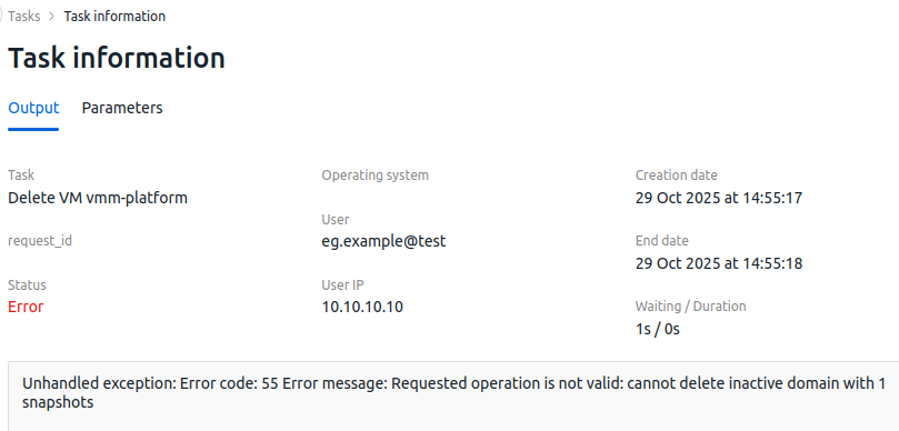 The error occurs when the VM has snapshots that were created using the virsh utility. Such snapshots are not displayed in the VMmanager web interface. At the same time, the system blocks the deletion of VMs with snapshots, regardless of how they were created.