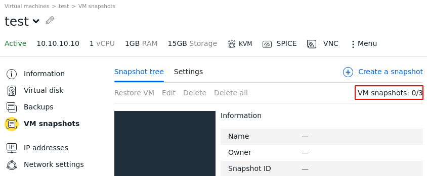 Meanwhile, the VM does not have any snapshots in the web interface (Virtual Machines → VM snapshots).