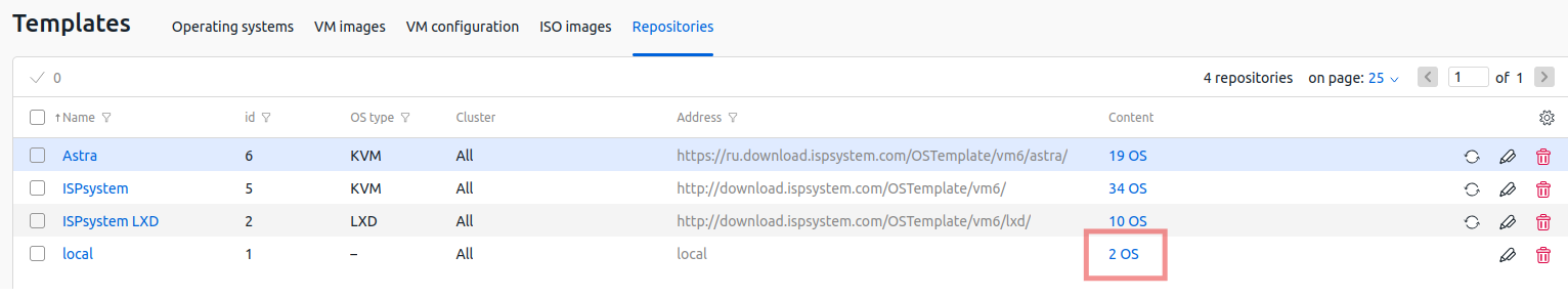 localrepository in the list. - In the Content column, click the button showing the number of OS templates (e.g., “2 OS”)