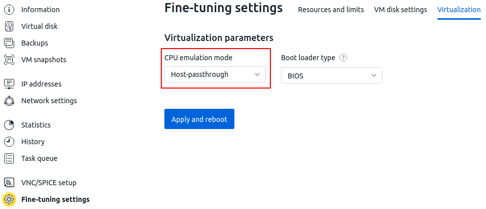 - Host-passthrough CPU emulation mode on the Virtualization tab.
